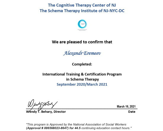 Схема-терапия – Институт Нью-Йорка и Нью-Джерси - это институт от основателей этого метода и людей, которые создавали схема-терапию. Это мое второе направление в работе. Оно стратегическое , направлено на работу со сложными кейсами и это на мой взгляд , одна из лучших американских програм. Я когда выбирал обучение, то выбирал между европейскими в Дании и этим, американским институтом. Я выбрал все-таки поехать к основателю и не жалею. Джефри Янг – это просто один из мастодонтов, талантливейших психотерапевтов , у которого я многому научился.